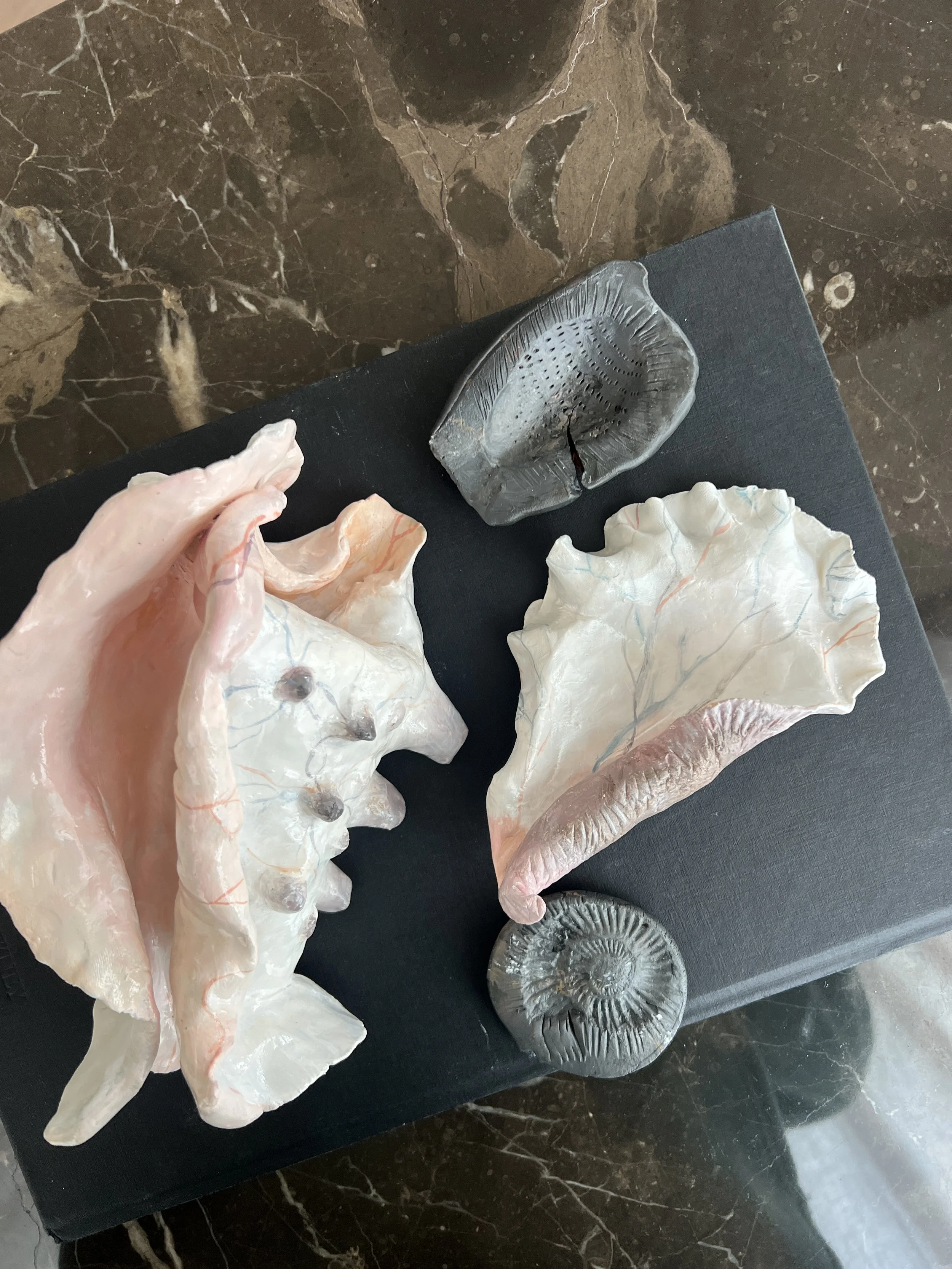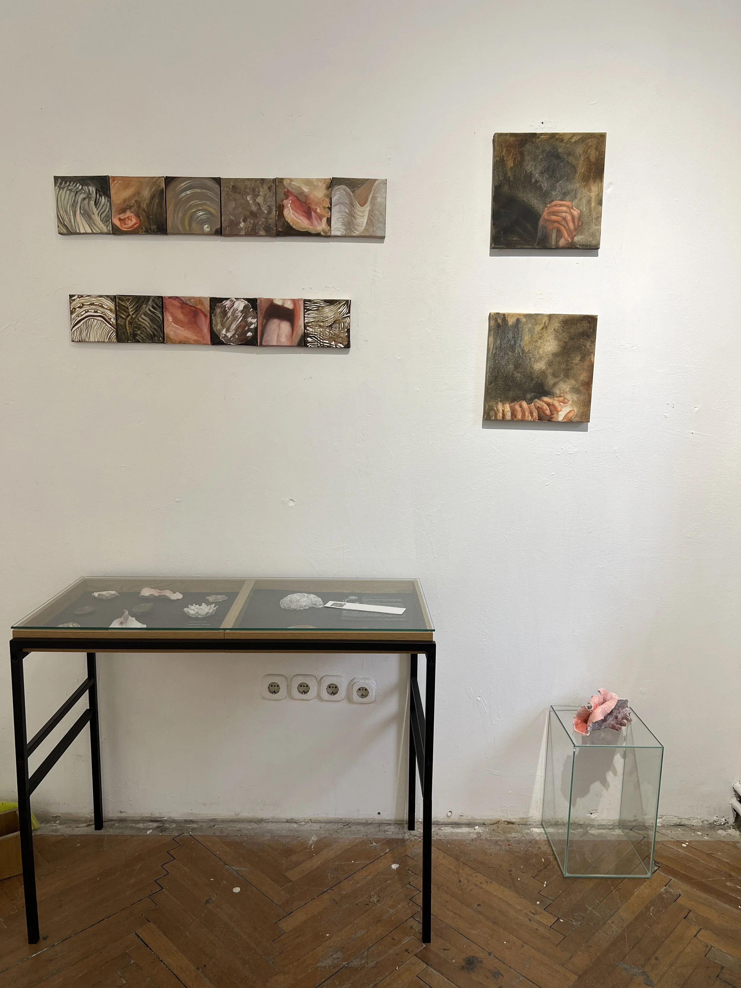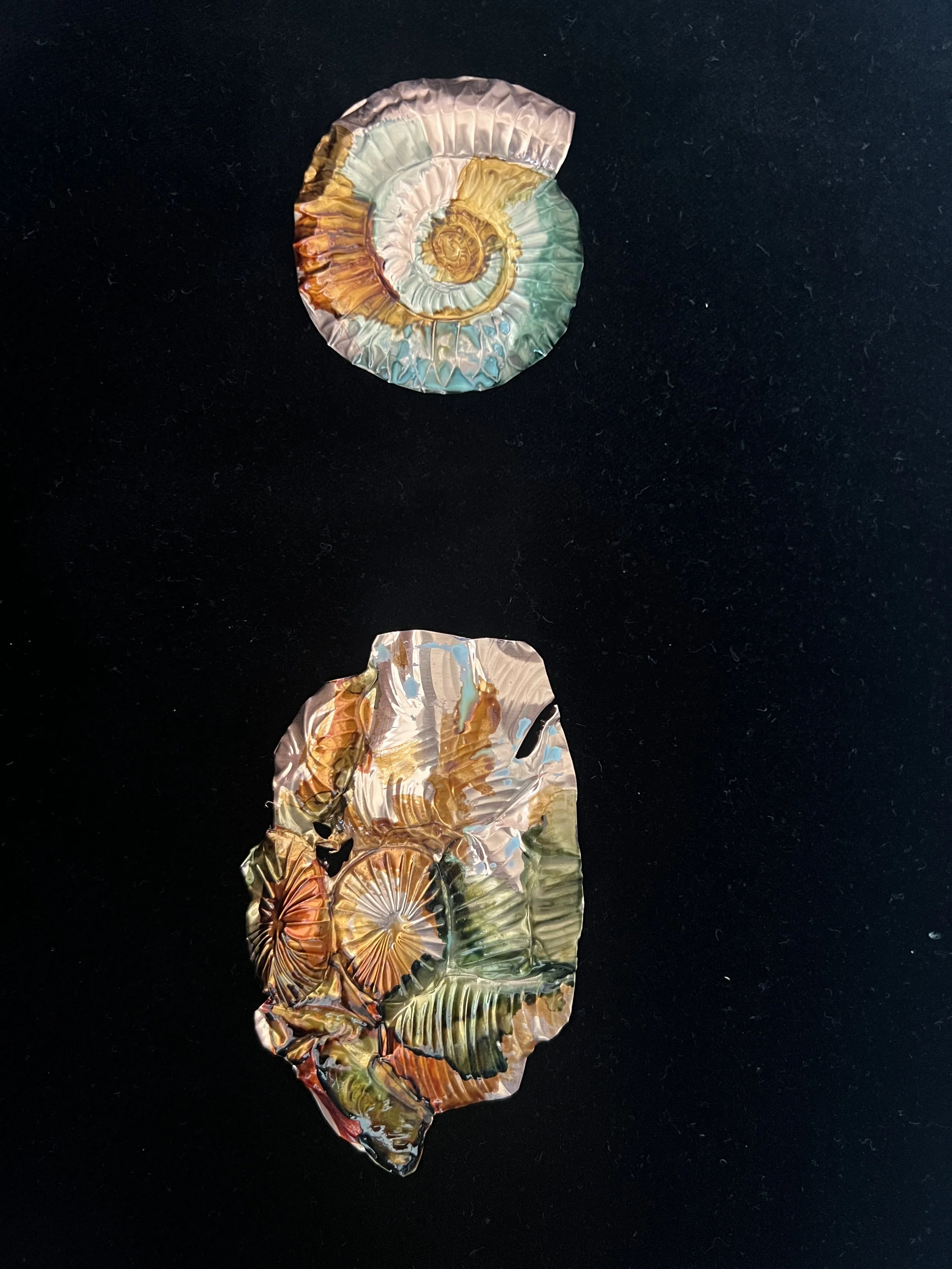 The objects are made of clay and etched metal leaf. They are complemented by small scale oil paintings on canvas.